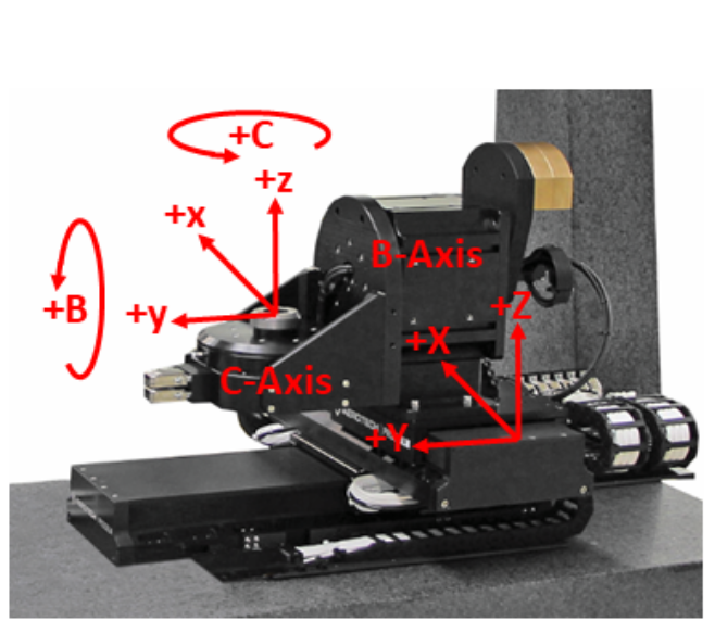For the system shown in Figure 4, the first rotary axis is the B-axis and it rotates in the z/x plane about the y-axis of our input plane. Positive rotation motion will be counter‐clockwise per the right hand rule. The next rotary axis is the C-axis which rotates the x/y plane about the z-axis. Positive rotation motion will also be counter‐clockwise. The rotation matrices are specified as follows: