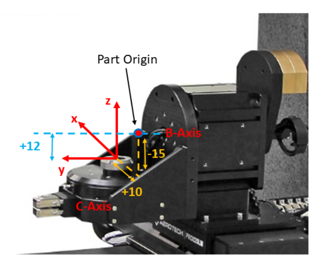 Using our example system, assume that the B and C axes of rotation intersect, the part origin is offset 15 mm above the tabletop of the C-axis and offset by 10 mm in the x direction, and the B-axis center of rotation is parallel to and in‐line with the y-axis and located 12 mm above the y-axis. Based on this configuration the offsets for the rotation commands would be as shown in Figure 5.